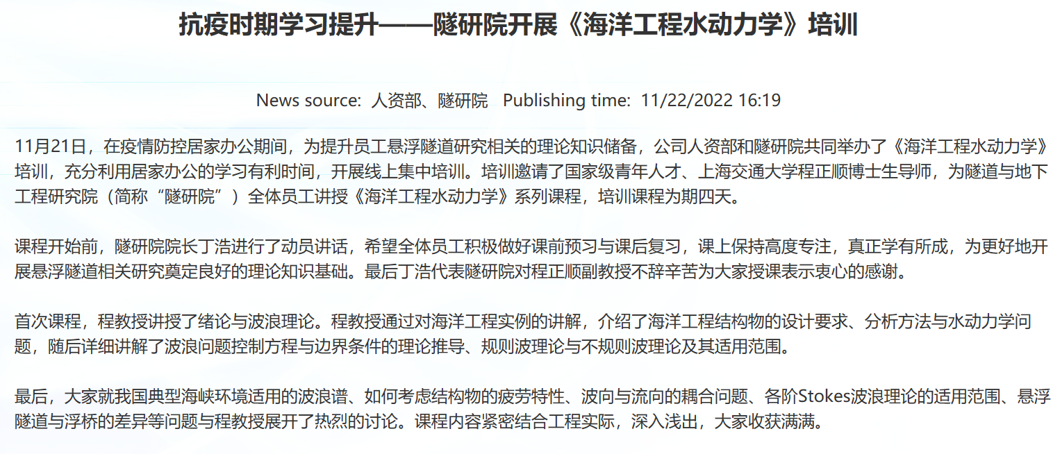 科研工作要想走在時(shí)代的前沿,離不開對(duì)新知識(shí)孜孜不倦的追求。利用大家居家辦公期間較為充裕的時(shí)間,隧道研究院聯(lián)合公司人力資源部共同舉辦了《海洋工程水動(dòng)力學(xué)》培訓(xùn),旨在提升員工懸浮隧道研究相關(guān)的理論知識(shí)儲(chǔ)備。培訓(xùn)邀請(qǐng)了國(guó)家級(jí)青年人才、上海交通大學(xué)程正順博士生導(dǎo)師授課,四天的培訓(xùn)課程充足而飽滿,讓懸浮隧道研究項(xiàng)目組成員及其他同事對(duì)相關(guān)領(lǐng)域有了全新的認(rèn)識(shí),為更好的開展懸浮隧道研究工作奠定了良好的理論知識(shí)基礎(chǔ)。