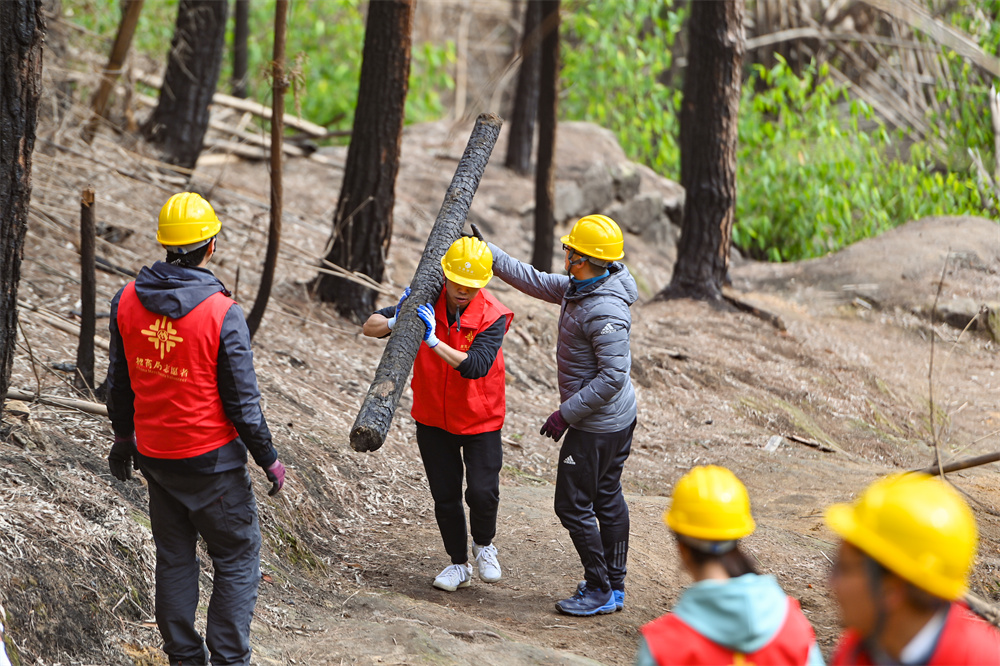 一群平日里拿“筆桿子”的科研工作者,滿懷公益熱忱,此刻化身招商局志愿者,一路向前,從鄉(xiāng)村道路到崎嶇山路再到陡峭山壁,從山下住戶到山火第一條隔離帶再到山火核心地帶,經(jīng)過一個(gè)多小時(shí)徒步前行,最終抵達(dá)待修繕路段,眼前的一幕幕景象深深震撼著每一位志愿者,隨處可見的殘根斷枝,焦黑色的痕跡猙獰可怖。望著這片受傷的山林,志愿者們心中的信念更加堅(jiān)定了。