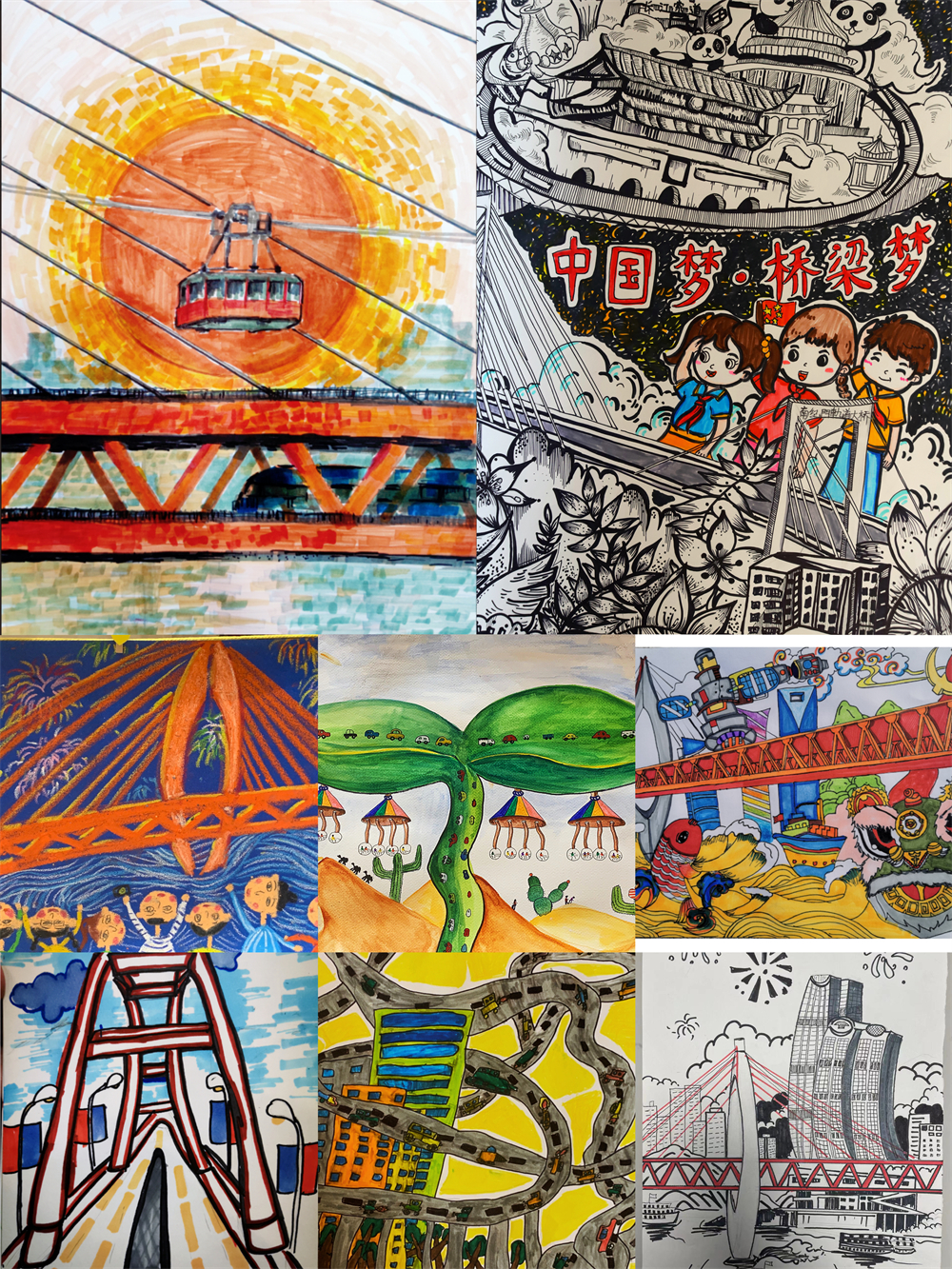 本次主題公益活動(dòng)深入貫徹黨的二十大精神,堅(jiān)持把科普作為提高全社會(huì)文明程度的重要舉措,牢固樹(shù)立“科技創(chuàng)新,科學(xué)普及是實(shí)現(xiàn)創(chuàng)新發(fā)展的兩翼,要把科學(xué)普及放在與科技創(chuàng)新同等重要的位置”的理念,力圖通過(guò)傳播橋梁科普知識(shí),落實(shí)“培育創(chuàng)新文化,弘揚(yáng)科學(xué)家精神,涵養(yǎng)優(yōu)良學(xué)風(fēng),營(yíng)造創(chuàng)新氛圍”的指示精神,活動(dòng)的成功舉辦有效激發(fā)了小朋友們的想象力,引導(dǎo)他們以手中的筆生動(dòng)地展示出心目中的重慶橋梁。畫(huà)展作品中,有用抽象的筆觸勾勒出深紅東水門(mén)大橋與橙黃太陽(yáng)的和諧畫(huà)面,以大膽的配色展示出千廝門(mén)大橋與新年煙花輝映的熱鬧場(chǎng)景,更有把輕軌穿樓、重慶火鍋、千廝門(mén)大橋畫(huà)在一起,突出了重慶獨(dú)特的文化風(fēng)貌。文字作品中,小朋友們關(guān)注到了橋梁養(yǎng)護(hù)工人的工作,以橋梁寄托了對(duì)親人的真摯思念情,記錄了非物質(zhì)文化遺產(chǎn)的傳承、經(jīng)濟(jì)社會(huì)的繁榮與發(fā)展,更是以生動(dòng)的語(yǔ)言挖掘出朝天門(mén)大橋面臨的前所未有的挑戰(zhàn)……他們寫(xiě)道“城市睡著了,橋?yàn)槿藗円龑?dǎo)方向?!?/div>