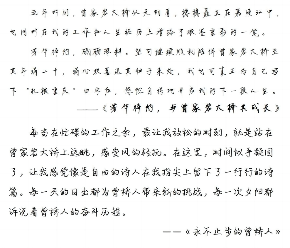 《芳華待灼,與曾家?guī)r大橋共成長》仿佛看到了作者與曾家?guī)r大橋一同砥礪深耕,“扎根重慶”時(shí)流下的汗水?!洞髳蹮o疆曾橋人 科技賦能優(yōu)服務(wù)》描繪了曾橋人如何用自己的智慧賦予了大橋生命。《永不止步的曾橋人》用不同的視角展現(xiàn)出了大橋建設(shè)過程中的艱辛……員工們通過一個(gè)個(gè)微小平凡的故事,表達(dá)了與曾家?guī)r大橋的共情共鳴,也讓大家感受到一座蓬勃向上、鮮活而生動(dòng)的曾家?guī)r大橋。
