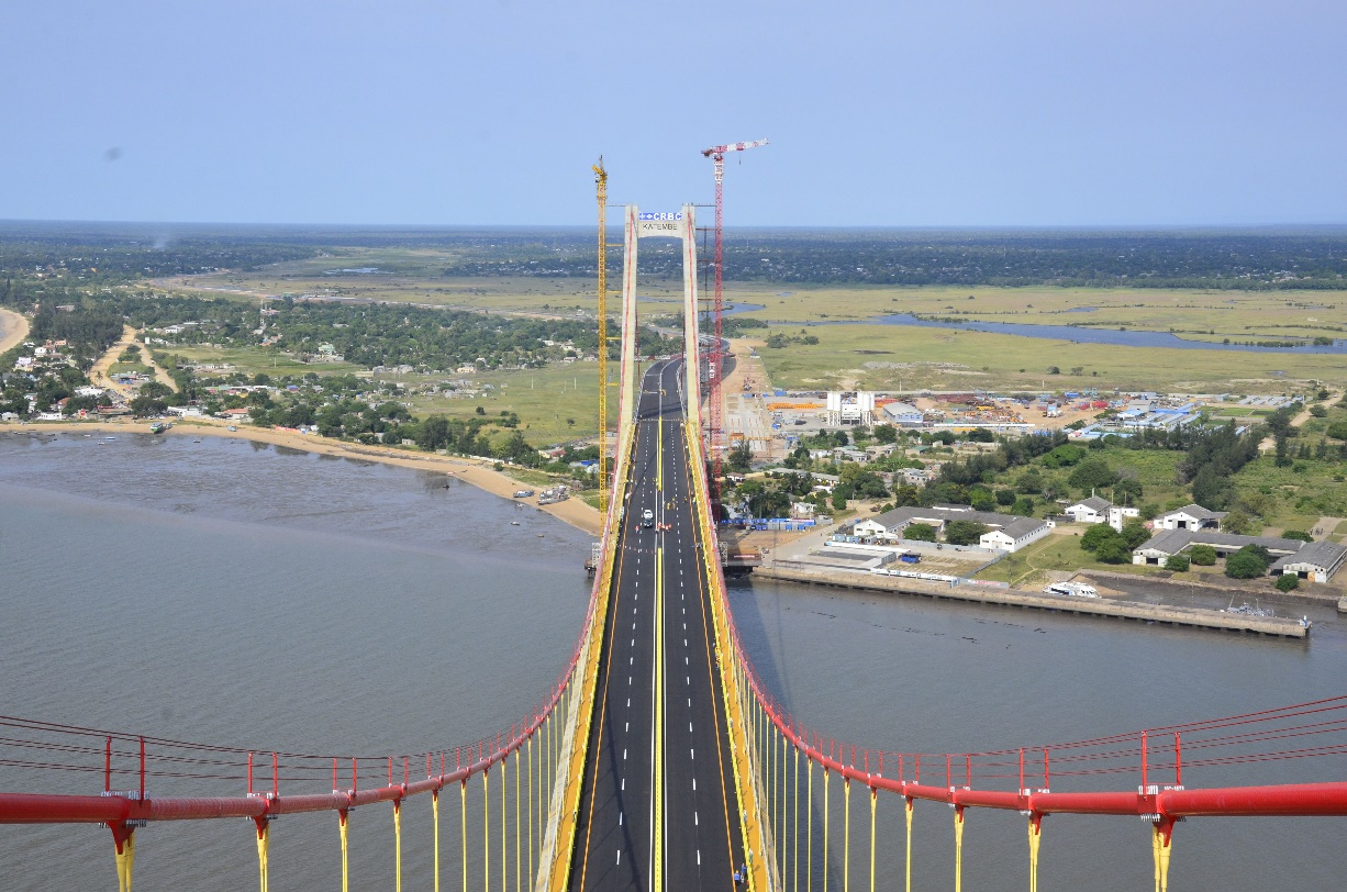 莫桑比克馬普托(Maputo)大橋及接線工程,為首都馬普托市向南去往南非與莫桑比克南部邊界口岸的干線公路,是非洲跨徑第一大的懸索橋,采用單跨雙鉸懸索橋,主纜跨度為(260+680+284)m,雙向4車道,鋼橋面鋪裝結(jié)構(gòu)為2mm甲基丙烯酸樹脂防水體系+35mm澆注式瀝青混合料GA10+38mm改性瀝青SMA10。